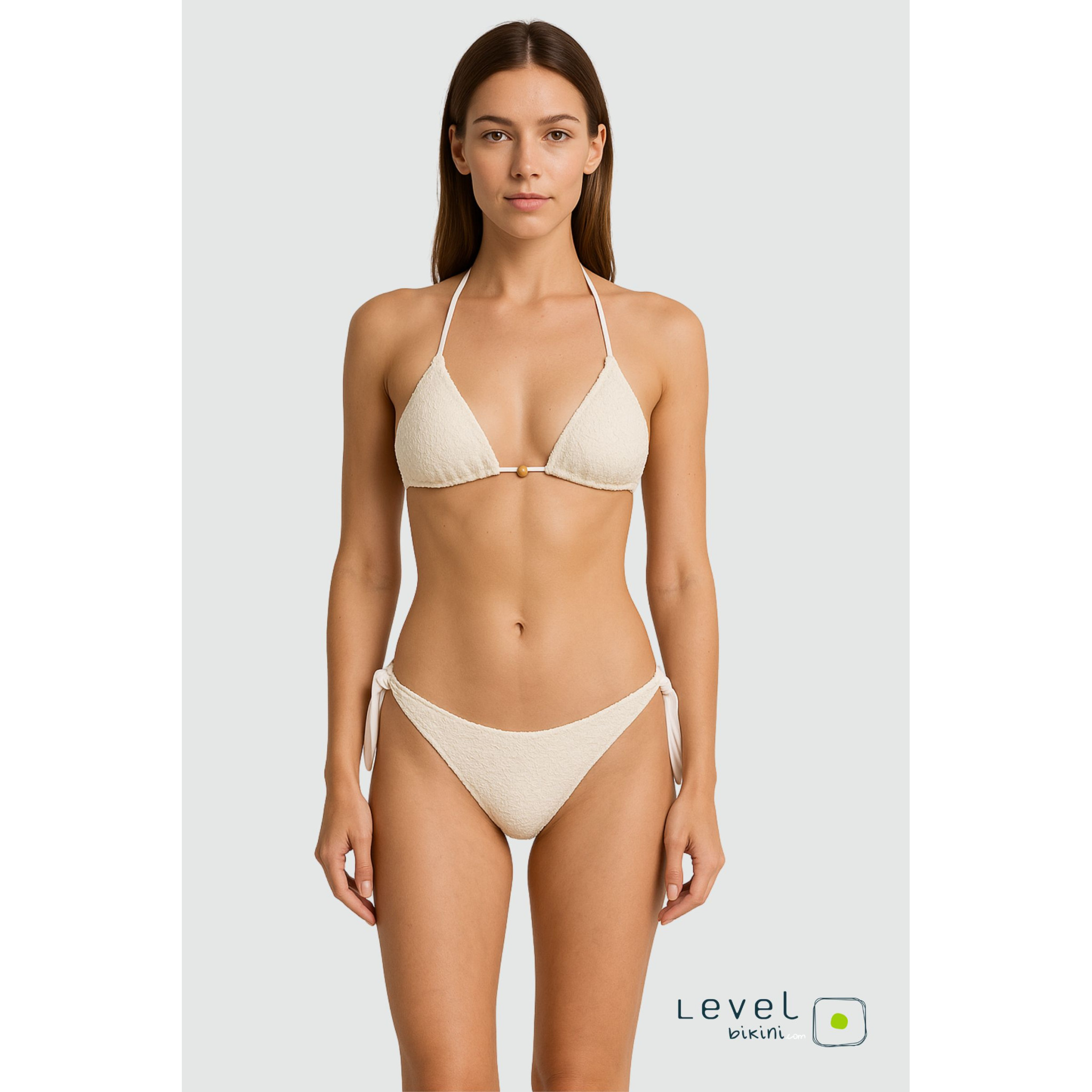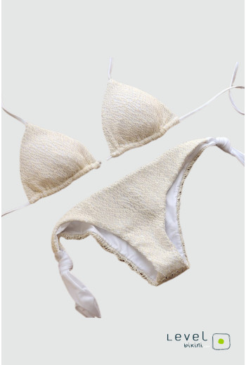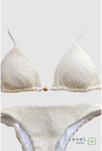 Bikini bianco in lycra con rete beige, triangolo con coppetta estraibile e slip fiocco. Dettagli con palline effetto legno per uno stile naturale ed elegante.