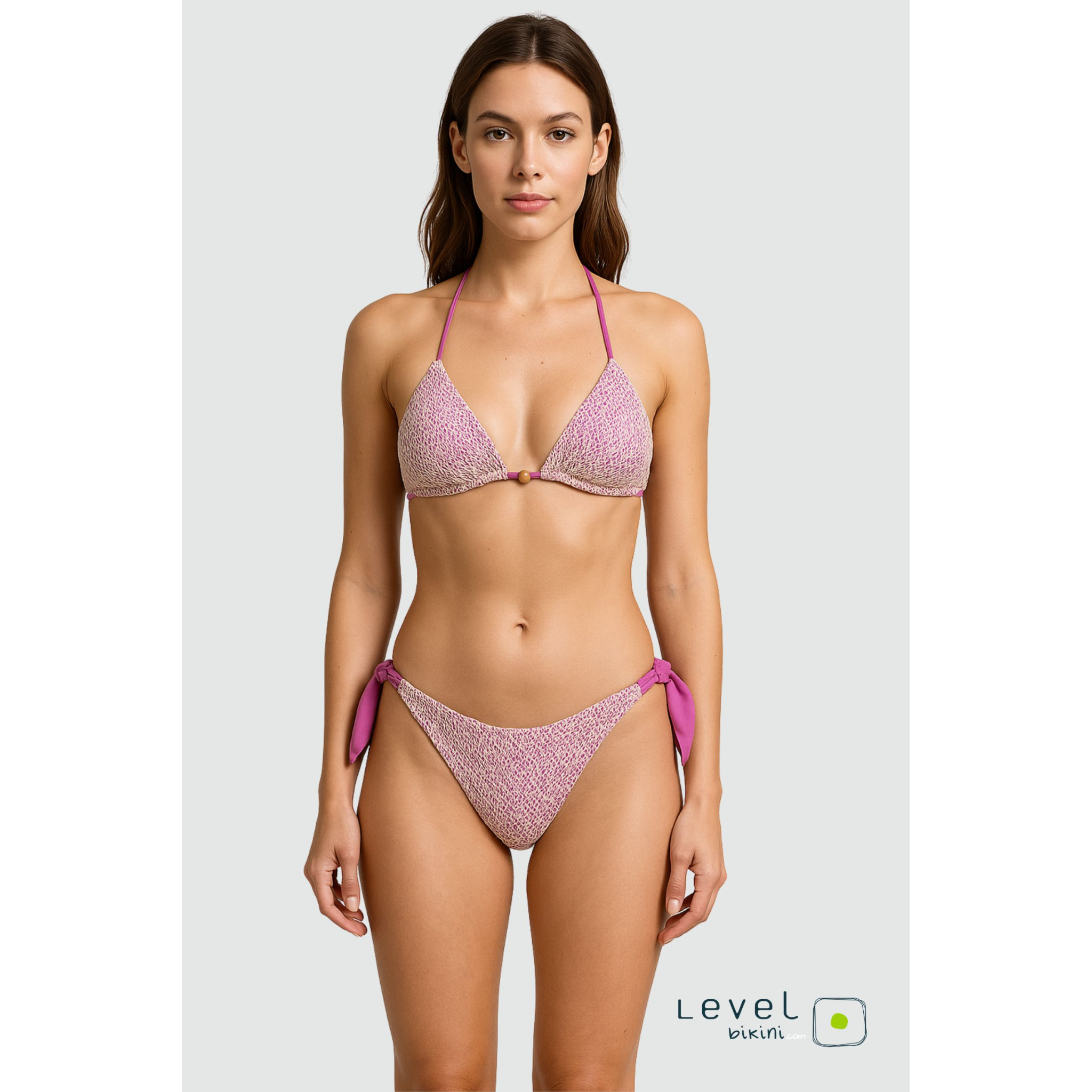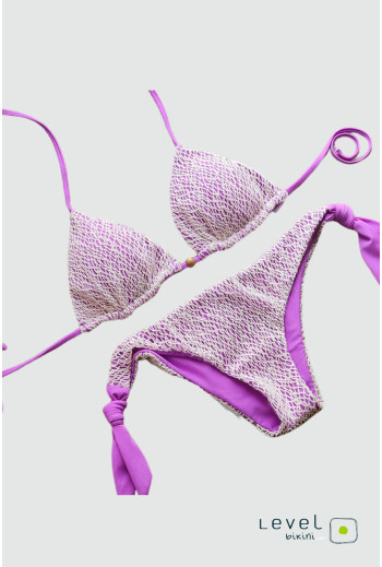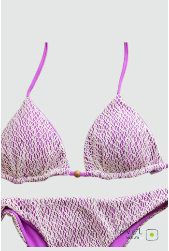Bikini lilla in lycra con rete beige, triangolo con coppetta estraibile e slip fiocco. Dettagli con palline effetto legno per uno stile naturale ed elegante.