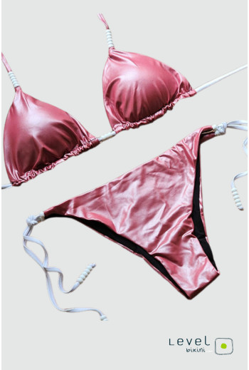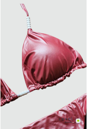 Bikini triangolo in tessuto specchiato color porpora con coppette estraibili, bretelle regolabili e slip con laccetti. Impreziosito da dettagli a palline bianche per un look elegante e luminoso.