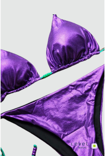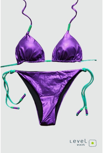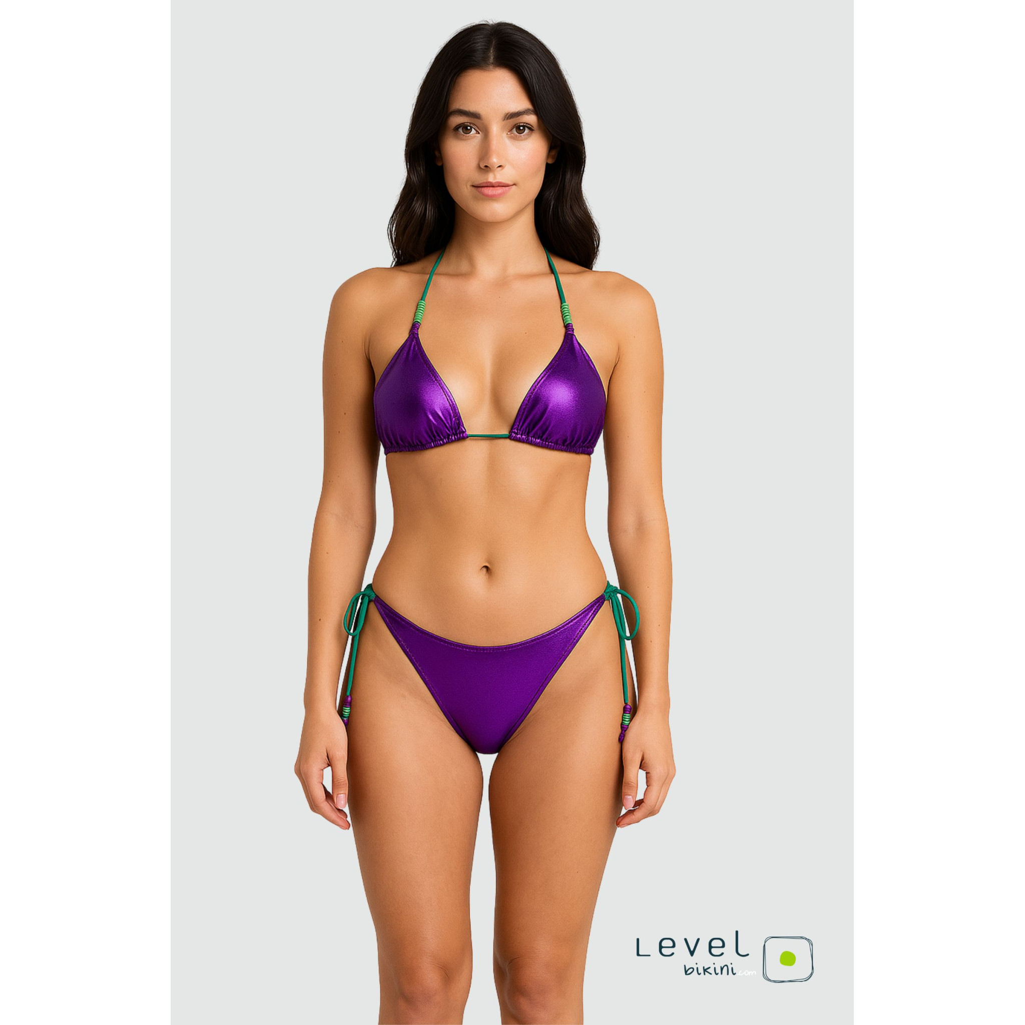 Bikini triangolo in tessuto spalmato viola effetto brillantinato, con coppette estraibili, bretelle regolabili e slip con laccetti. Dettagli a palline verde per un look luminoso e vivace.