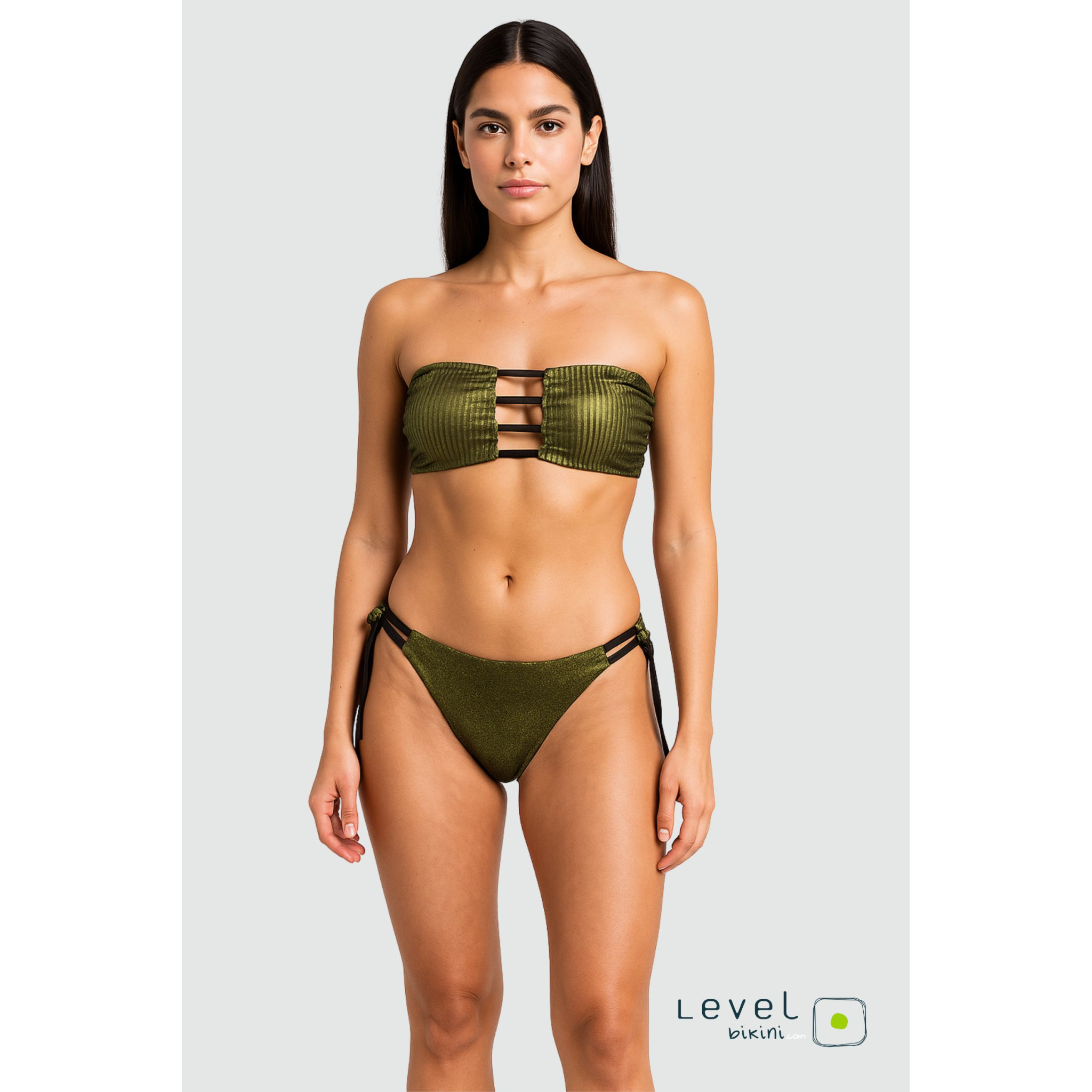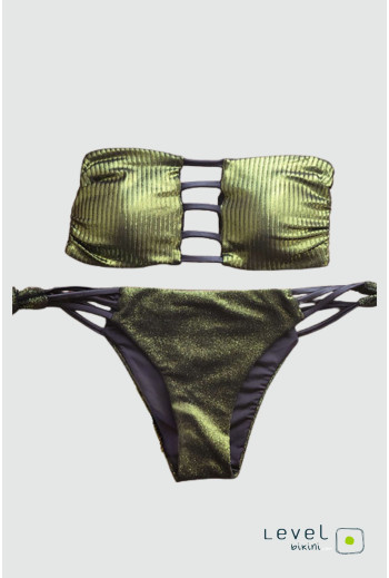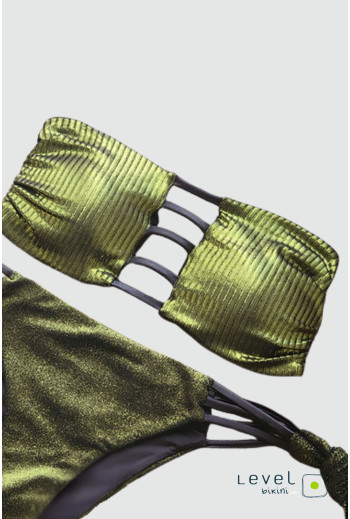 Bikini fascia con coppette estraibili e laccetto sganciabile da annodare sulla schiena. Slip con fiocco e laccetti leggermente sgambati. Realizzato in tessuto goffrato e glitter verde smeraldo, morbido e luminoso.