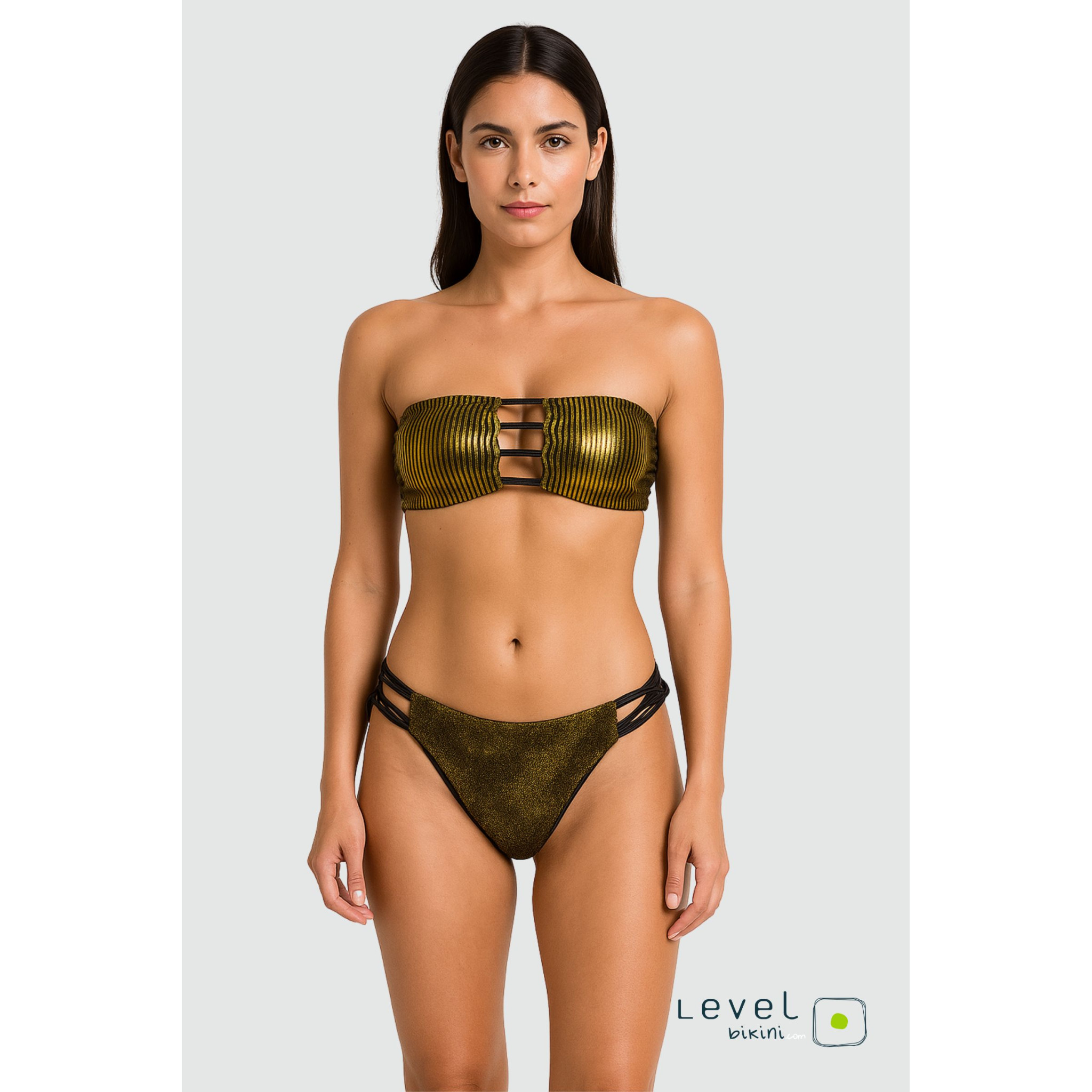 Bikini fascia con coppette estraibili e laccetto sganciabile da annodare sulla schiena. Slip con fiocco e laccetti leggermente sgambati. Realizzato in tessuto goffrato e glitter oro, morbido e luminoso.